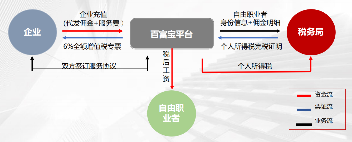 2.企業(yè)通過(guò)百富寶平臺向自由職業(yè)者發(fā)放傭金,平臺自動(dòng)劃扣個(gè)稅至稅源地稅務(wù)局;
